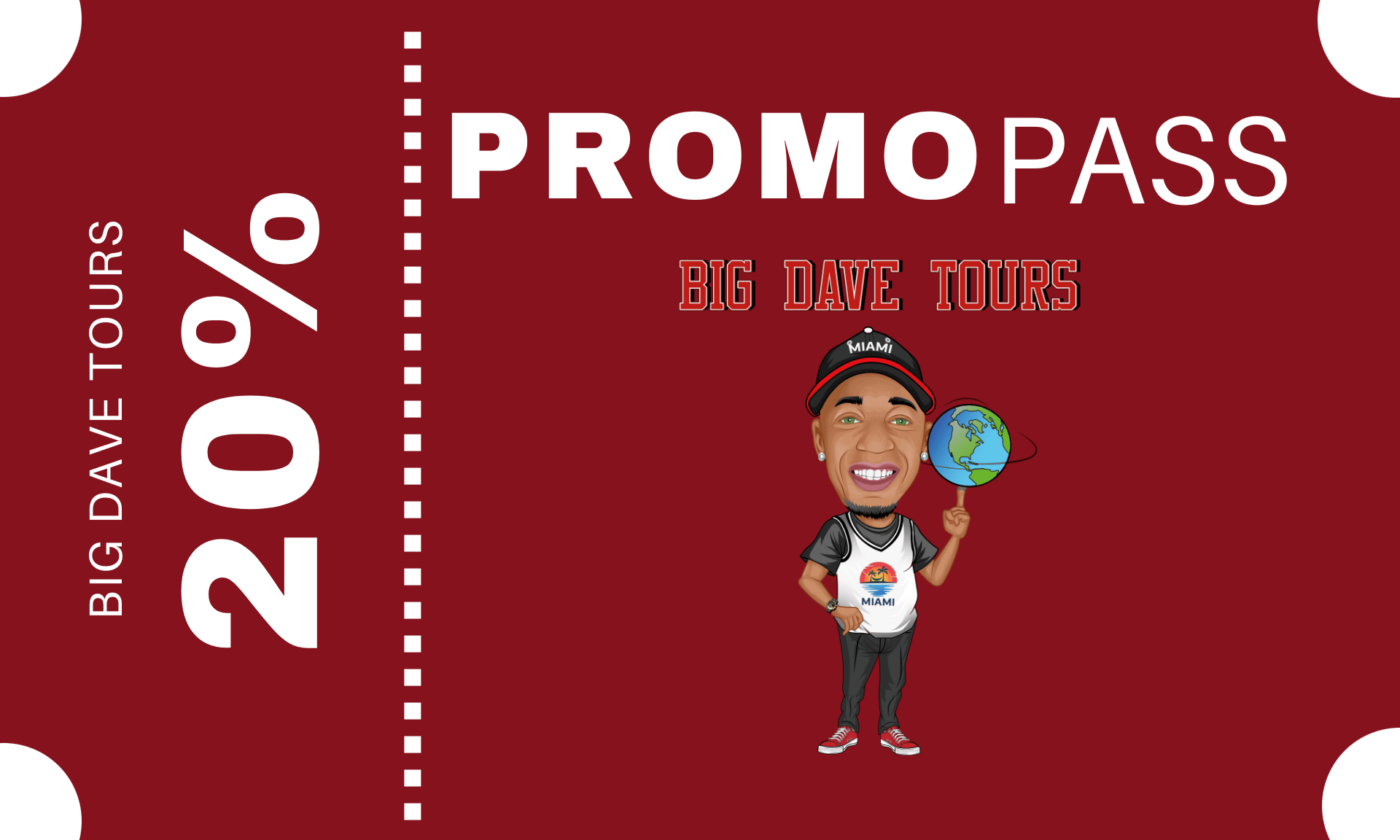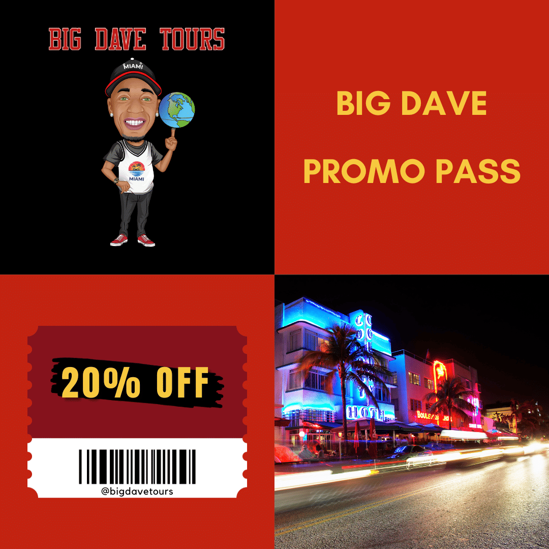 "Discover Miami like never before with our exclusive promotional pass from www.bigdavetours.com! Benefit from an instant 20% discount on the best-sellers from our renowned travel agency. Whether you're passionate about South Beach's art deco, the trendy neighborhoods of Wynwood, or enchanting cruises in Biscayne Bay, this pass opens the doors to adventure at an exceptional price.